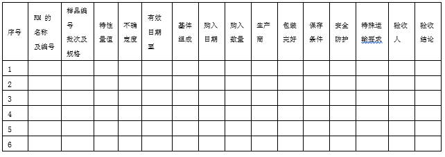 實(shí)驗(yàn)室應(yīng)對(duì)上述中必要的驗(yàn)收內(nèi)容形成記錄。適用時(shí),RM驗(yàn)收記錄至少要包括:RM名稱、編號(hào)、批號(hào)、特性量值、不確定度、有效日期、購(gòu)入日期、購(gòu)入數(shù)量、生產(chǎn)商、驗(yàn)收人、驗(yàn)收結(jié)論等。