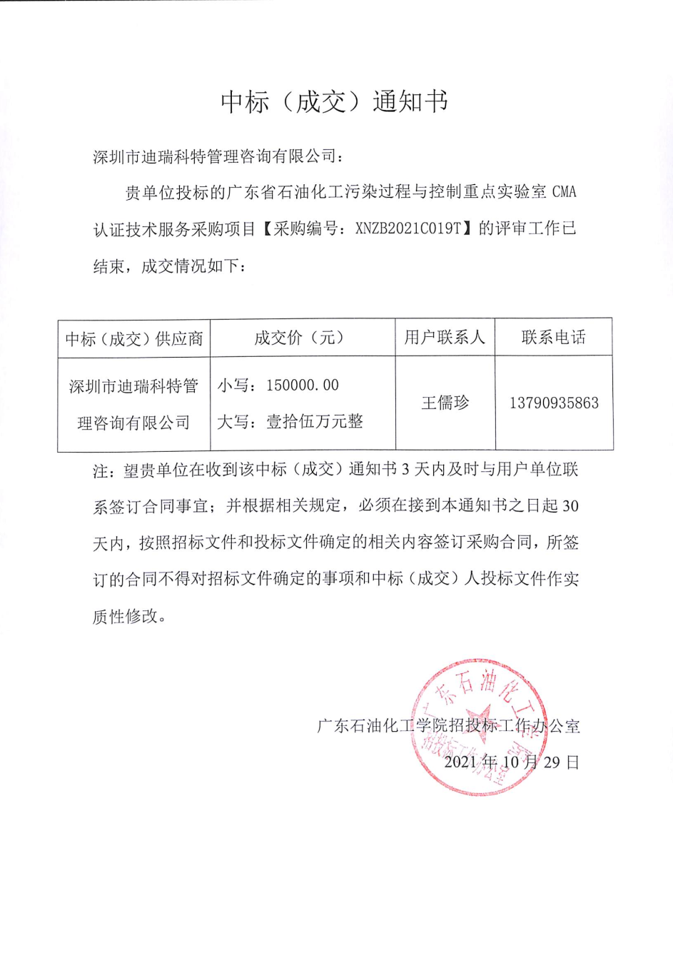2019年10月29日,熱烈祝賀我司在廣東石油化工學(xué)院招標(biāo)工作辦公室組織的“廣東省石油化工污染過(guò)程與控制重點(diǎn)實(shí)驗(yàn)室CMA認(rèn)證技術(shù)服務(wù)采購(gòu)招標(biāo)項(xiàng)目”(項(xiàng)目編號(hào)為:XNZB2021C019T)公開(kāi)招標(biāo)中,成為該項(xiàng)目的中標(biāo)單位。