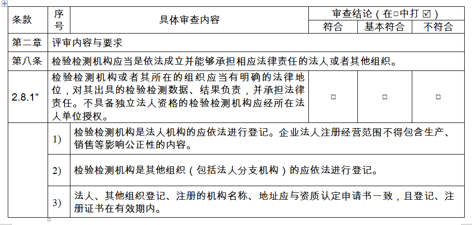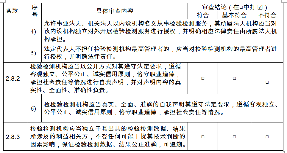 a.審查檢驗(yàn)檢測(cè)機(jī)構(gòu)的法人地位證明材料,審核其經(jīng)營(yíng)范圍是否包含檢驗(yàn)檢測(cè)的相關(guān)表述,并符合公正性要求;非獨(dú)立法人檢驗(yàn)檢測(cè)機(jī)構(gòu)是否提供了所在法人單位的授權(quán)文件;