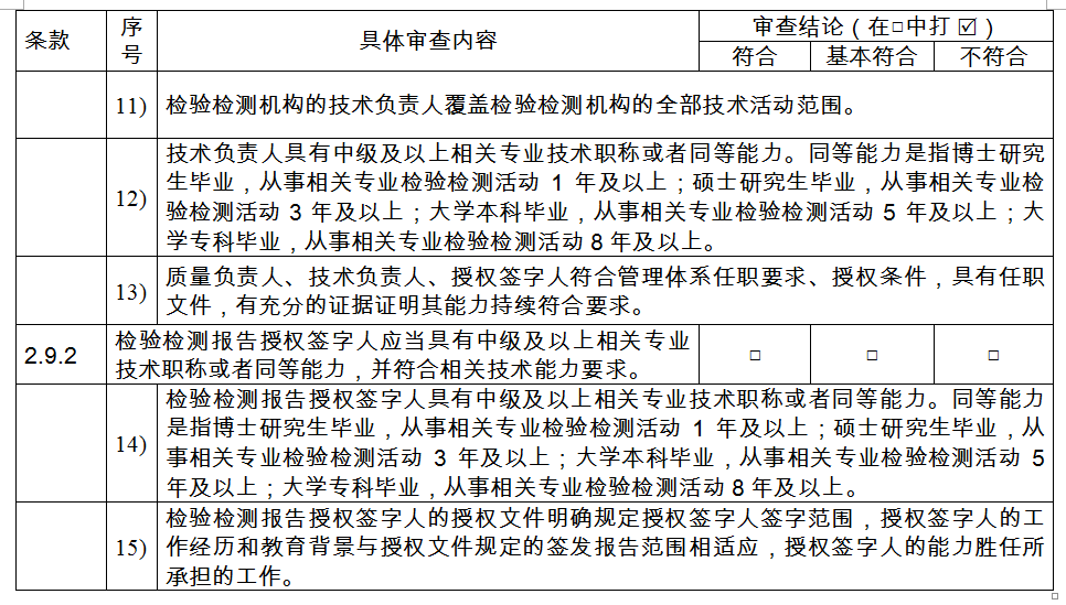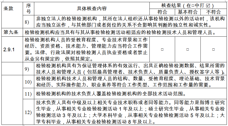 第九條 〔人員評(píng)審要求〕檢驗(yàn)檢測(cè)機(jī)構(gòu)應(yīng)當(dāng)具有與其從事檢驗(yàn)檢測(cè)活動(dòng)相適應(yīng)的檢驗(yàn)檢測(cè)技術(shù)人員和管理人員。