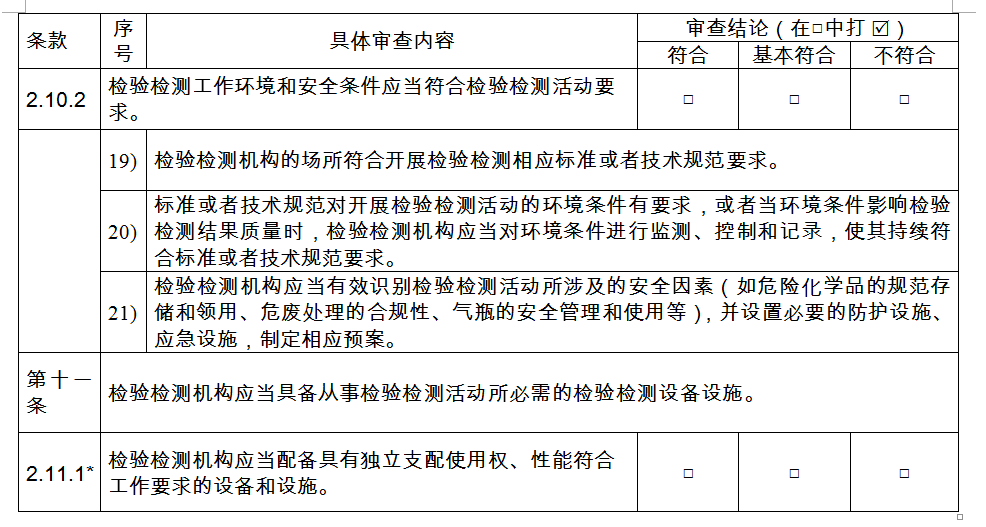 第十條 〔場(chǎng)所環(huán)境評(píng)審要求〕 檢驗(yàn)檢測(cè)機(jī)構(gòu)應(yīng)當(dāng)具有固定的工作場(chǎng)所,工作環(huán)境符合檢驗(yàn)檢測(cè)要求。