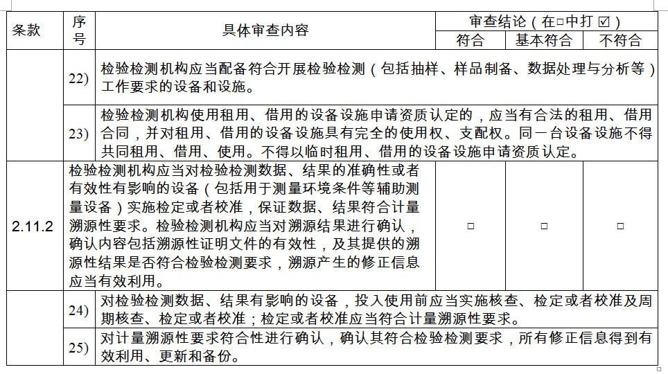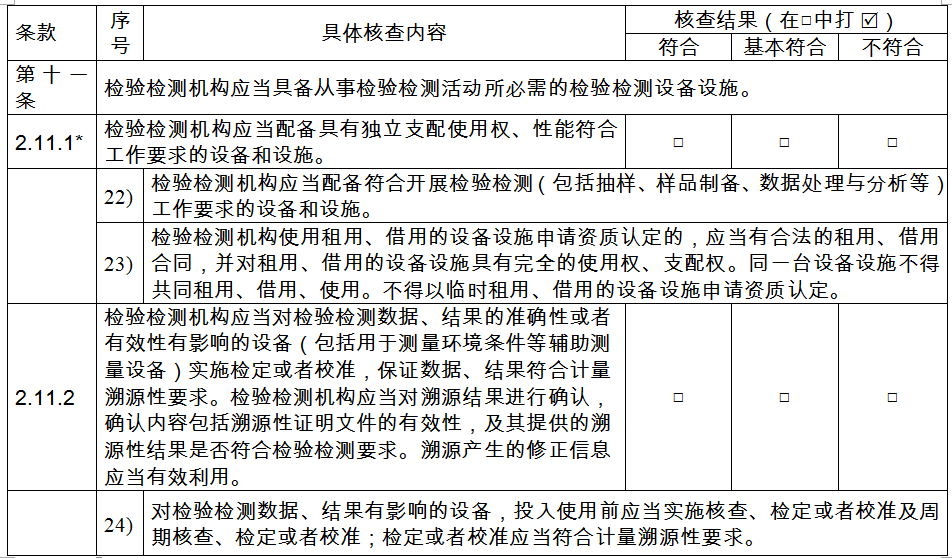 第十一條 〔設(shè)備設(shè)施評(píng)審要求〕檢驗(yàn)檢測(cè)機(jī)構(gòu)應(yīng)當(dāng)具備從事檢驗(yàn)檢測(cè)活動(dòng)所必需的檢驗(yàn)檢測(cè)設(shè)備設(shè)施。