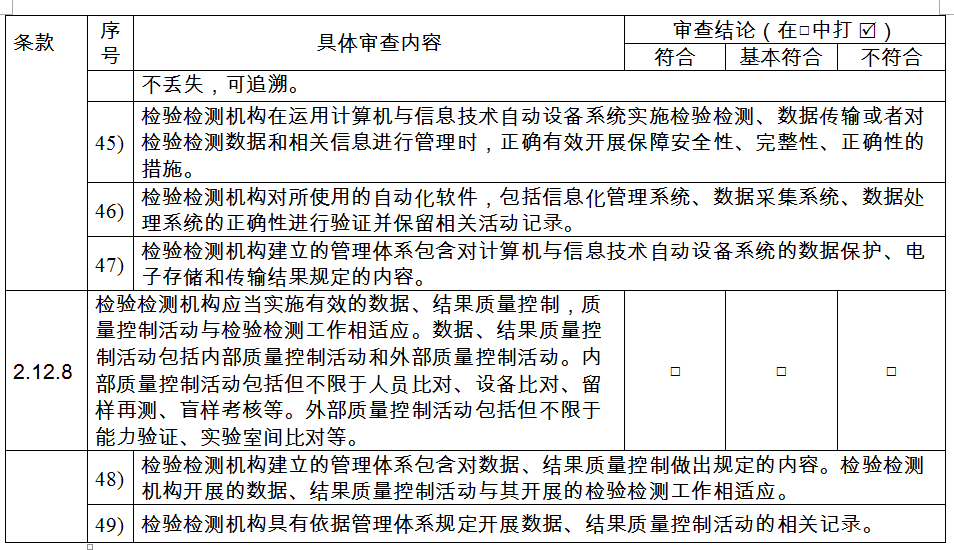 (七)檢驗(yàn)檢測(cè)機(jī)構(gòu)在運(yùn)用計(jì)算機(jī)與信息技術(shù)自動(dòng)設(shè)備系統(tǒng)實(shí)施檢驗(yàn)檢測(cè)、數(shù)據(jù)傳輸或者對(duì)檢驗(yàn)檢測(cè)數(shù)據(jù)和相關(guān)信息進(jìn)行管理時(shí),具備保障安全性、完整性、正確性措施。