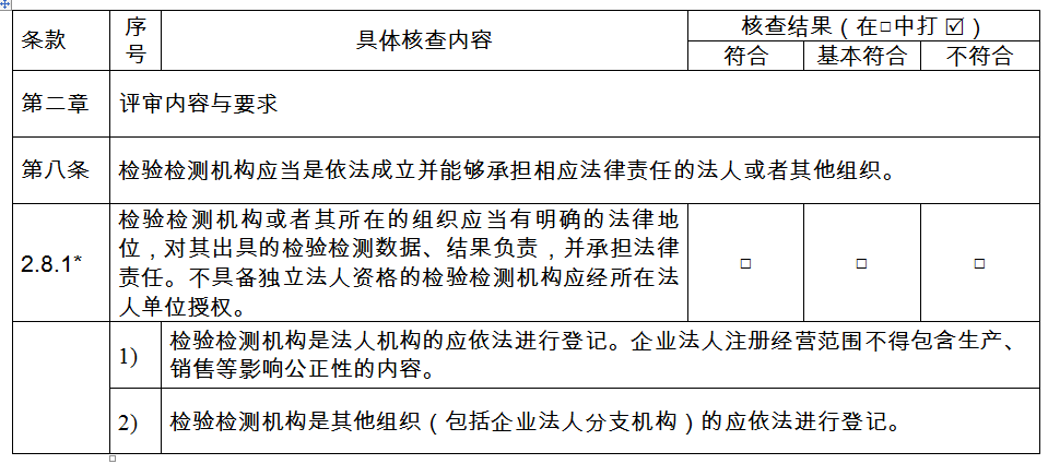第八條 〔機(jī)構(gòu)主體評(píng)審要求〕檢驗(yàn)檢測(cè)機(jī)構(gòu)應(yīng)當(dāng)是依法成立并能夠承擔(dān)相應(yīng)法律責(zé)任的法人或者其他組織。