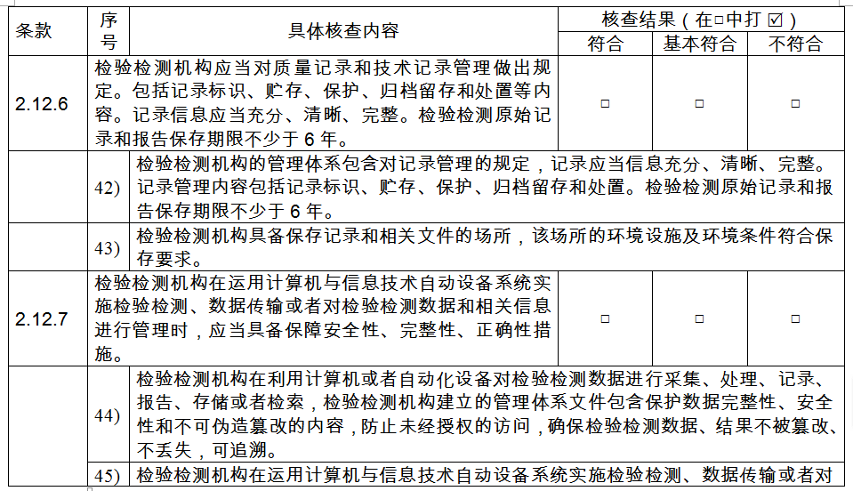 (六)檢驗(yàn)檢測(cè)機(jī)構(gòu)應(yīng)當(dāng)對(duì)質(zhì)量記錄和技術(shù)記錄管理做出規(guī)定。包括記錄標(biāo)識(shí)、貯存、保護(hù)、歸檔留存和處置等內(nèi)容。記錄信息應(yīng)當(dāng)充分、清晰、完整。檢驗(yàn)檢測(cè)原始記錄和報(bào)告保存期限不少于6年。